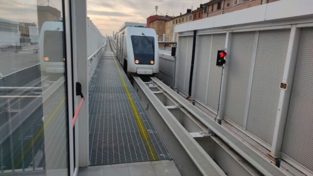 Přílet ve večerních hodinách, rozuměj za tmy, byl mírně řečeno rozpačitý. S davem jsme se vydali do stanice Marconi expressu, malého vlaku spojujícího letiště s centrem města. Cena jednosměrné jízdenky je 8,7 €, při koupi zpáteční je cena 16 €, ale i tak se sedmi minutová a sedmi kilometrová jízda vlakem cenou značně přiblížila hodnotě letenky. Zajímavé je využití podvozků s nafukovacími koly (pneumatiky) – od toho bych čekal mírně lepší komfort jízdy, než jaký jsme zažili. Vůz srovnatelný s průměrným autobusem je rozdělený na dvě kupé, přičemž pohodlné cestování by bylo tak pro 20 lidí dohromady. Nás se nacpalo do jedné kabinky minimálně 30, ale protože vlak jede stejně jako horská dráha a na „kolejnicích“ se odráží tak nějak ze strany na stranu a nepředvídatelně se naklápí, bylo vlastně dobře, že nebylo kam spadnout.