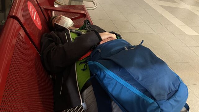 Kolem půlnoci jsme zahájili cestu „zpět“ na letiště, pěšky minimálně 7 km, abychom zde přečkali noc. Poslední vlak jsme nevědomky nechali ujet, takže nám nic jiného nezbývá, hotel jsme pro tentokrát neřešili. Letiště je bohužel vybaveno jen kovovými sedačkami s područkami, přes které se nedá nijak lehnout, takže jsem přes veškerou snahu usnul asi na deset minut, Jája zvládla prospat ze 6 hodin skoro 3. Když už se nedalo na sedadlech vydržet, zvedli jsme kotvy.