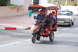 Cesta na hotel probíhala autobusem cestovní společnosti. Pokud cestujete na vlastní pěst, stojí u letiště taxíky. Ty oranžové jsou městské, ty co jsou jiných barev, nejspíš bílé, pak meziměstské. Ceny za taxi jsou více než příznivé, cca 3km stály asi 12 dirhamů (30 Kč), v noci jsou pak ceny mírně vyšší. Základním předpokladem je ale donucení řidiče, aby zapnul taxametr – někteří to dělají neradi, ale pokud jedete bez něj, vždy zaplatíte i násobně víc! Místní měnu je asi nelepší vybrat z bankomatu a s rozumem, směna zpět na eura může být problematická a berou zpět jen papírové dirhamy. Ne všechny bankomaty mají ale stejný kurz, náš přímo v hotelu byl znatelně nevýhodný a nabízel jen malé částky.