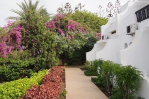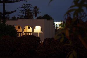 Hotelový komplex Les Omayades (trois étoiles = ***) mile překvapil. Recepční byli schopni komunikovat v angličtině i francouzštině, pokoj adekvátní velikosti s koupelnou, a navíc s vlastní terasou. Sice se paní uklízečka vyžívala v sundavání povlaků z polštářů a neobtěžovala se dávat nové, ale ke konci pobytu nám z 8 polštářků dva na spaní stále zbývaly. Komplex je poměrně rozsáhlý, budovy jsou vesměs nízké a terasovitě stavěné v kopci. Nejedná se o žádný megahotel, který by hyzdil pobřeží, je spíše nenápadný a zapadá do rázu města. Výhodou je umístění hned vedle jednoho z královských paláců, který je neustále střežený, takže i v ulicích kolem hotelu je velmi bezpečno. Jídlo místní kuchyně však lépe vypadá než chutná. Většina byla jak se říká nemastná, neslaná, ideálně chutnající po rybě. Image kuchyně vylepšovalo ovoce a snídaňové čtverhranné „lívanečky“ čerstvě připravované z nějakého speciálního těsta a se sladkým sirupem. Rozhodně nezapomeňte ochutnat „tažin“, pokrm připravovaný v pánvi s kuželovitou pokličkou, většinou ze zeleniny a ryb.