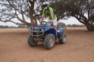 Co si rozhodně nenechte ujít je adrenalinový zážitek na čtyřkolkách. Nabízejí je téměř všichni místní prodejci zážitků. My byli dovezeni několik kilometrů za město a měli jsme soukromého „průvodce“ pro dva lidi, jízda byla přiměřená amatérským řidičům, kteří se ale chtějí pobavit. Doprovod na nás celou cestu koukal jestli jedeme v pořádku. Projeli jsme pláně, vylezli na stromy, viděli berberskou vesnici s mešitou a ochutnali mátový čaj u místní rodiny. Zážitek byl opravdu skvělý, nenucený, jen oblečení v prašném prostředí dostalo pořádně zabrat. Nakonec nás proudem vzduchu ofoukli, ale na bílé triko zapomeňte. Stejní prodejci většinou nabízejí i plážové zážitky jako parasailing, banán atd, včetně vodních skútrů. Tomu jsme také neodolali. Na skútru jsme dostali povinné vesty, „vymezené“ území na širém moři, instrukce abychom nepřejeli plavce a všechny z dáli hlídal dozor, který se celkem hodil když jsme skončili ve vodě asi po dvou minutách jízdy. Oproti evropským destinacím jsou ceny velmi příznivé, a hlavně se vždy nechá smlouvat!