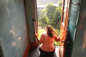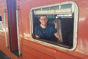 V první zatáčce vidíme, že delší zastávka byla kvůli výměně nákladních vagónů za lokomotivou. Vlak se taky značně naplnil, převážně bělochy. Cestou jsme si vzpomněli na náš přejezd přes koleje pár dní zpět – svítí červená světla a před námi tři auta. První to psychicky nevydrží a před uzavřením závor projíždí, další vzápětí za ním. Závory se začínají zavírat, ale náš řidič už čekat nehodlá a ještě se procpe, na druhé straně přejezdu je naštěstí volný prostor pro průjezd vedle uzavřené závory… Proč a kam tak spěchal nechápeme, ale zděšení jsme byli řádně.