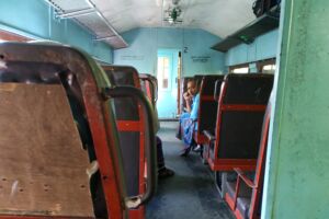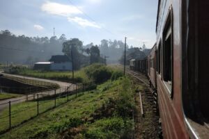Nějaký vlak přijíždí pár minut po sedmé a za lokomotivou jsou i nějaké nákladní vagóny, tak se příliš dovnitř nehrneme, ale domorodci říkají, že jede směr Ella. Naskakujeme trochu nejistě dovnitř a ptáme se, kam si s těmi lístky můžeme sednout – první třída samozřejmě nepřipadá v úvahu – a jsme nasměrováni ze třetí třídy do vedlejšího vagónu druhé třídy. Přesně v 7:13 odjíždíme. Vlaky nejsou o nic horší než ty, co jezdily ještě před pár lety na trase Praha – Cheb, navíc jsou vybaveny větráky na stropě a mají modernější led osvětlení a čistější sedačky. Akorát na područkách chybí obložení, takže jsme se během cesty párkrát pěkně křápli do loktů a stehen. Cesta je naprosto nádherná, hezčí už v být nemůže a jsme z té krásy oba dojatí – poznámka ženy: ukápla i nějaká slzička. Dieselová lokomotiva sice čadí víc jak uhelná elektrárna a v tunelech se nedá dýchat, ale cesta mezi plantážemi je prostě úžasná a všude kolem je neuvěřitelně zeleno. Koleje se mírně vlní a odhaduji, že rychleji než 50 km/h nejedeme, a ani bych asi rychleji raději nejel, už tak to celkem hází.