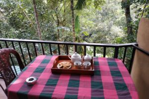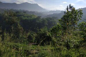 Spodek domu ještě není hotový, ale vršek je nejspíš úplně nově vybudovaný. Srílančané mají takovou divnou vlastnost, že když už něco funguje nebo trochu vypadá, tak proč to dodělávat za další prachy – mimochodem v koupelně mají ještě stále obaly na kachličkách 🙂… Tím se řídí v podstatě vše, například v pokoji máme sloupek u zdi s ubrusem a květinou. Pod tím je ale ještě schovaná hromádka suti a cihly bez omítky. Dostáváme čaj a sušenky a jdeme se pokochat výhledem do džungle. Jája se ještě s paní domácí neobratně baví o durianu a jackfruitu a kde je sehnat. Nedbá mého pokynu, aby na paní domácí mluvila stručně a jednoduše, paní angličtinu ovládá hodně skromně. Ta odešla zřejmě s nedorozuměním a se slovy, že řekne manželovi, načež o chvíli později leze muž před naším balkónem na strom a jeden obří jackfruit trhá.