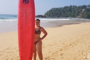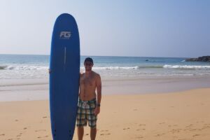 Nezůstáváme ale dlouho ležet. Hned vedle půjčují surfová prkna za 400 rupií, tak to musíme zkusit. Nejprve s tím, že je vezmeme na 2 hodiny, naštěstí jsme si to rozmysleli a dali hodinu jen jednu. Vůbec netušíme, jak na to, ale surfaře v televizi jsme viděli všichni… Počkat na vlnu, rychle pádlovat rukama a nabrat rychlost, pak už to jede samo a stačí si stoupnout. Většina prvních sto pokusů skončila nezdarem, jen občas se podařilo nenechat se z prkna smést vleže. Po půl hodině už se dokážeme nechat alespoň trochu vlnou táhnout, aniž bychom spadli, ale je to pořádně vyčerpávající. Ke stání na prkně máme ještě dlouhou cestu. Mnohem blíž máme k mořskému dnu. Vstup do vody je tu příjemně pozvolný, takže utopení nám snad nehrozí. O deset minut později jde Jája zničená na břeh, že prý se v tom kolotoči vln křápla do hlavy a já zůstávám sám. Za celou hodinu se mi nepodařilo pořádně vychytat, jak jet „před“ vlnou, většinou jedu až s proudem za ní a moře mě vyplavuje na pláž jako mrtvou oliheň. Asi jsou vlny moc malé, v Hawaii Five-O to vypadalo podstatně jednodušší. Surfy zničení vracíme, chvíli se opékáme z druhé strany a kolem 11 se raději balíme do stínu, slunce peče tak, že místní slepice snášejí vejce na tvrdo.