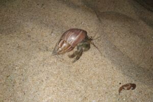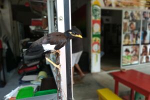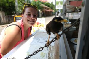 Po sprše a odpočinku konstatujeme, že třicítka krém bude asi málo, po 2,5 hodinách na slunci jsme trošku načervenalí. Navíc mi pod rukama praskla nádobka s krémem, takže je nepřenosná. Na průzkum města mažeme i trochou padesátky a tuktukem se necháváme dovézt do restaurace pro domorodce. Vysadil nás na celkem příjemném místě zvanem Coco Gate, rozhodně méně poznamenaném plážovým turistickým ruchem. Dokonce zde mají i ochočeného ptáčka a čekání na jídlo nám krátí snaha ho nalákat na ruku. Ve městě se sháníme ještě po spreji na komáry – těch je tu spolu s obřími mravenci požehnaně, a po novém opalovacím krému. S tím jak už jsme sežehnutí bereme raději šedesátku. Koukáme po pár suvenýrech, ale zatím nic, co bychom chtěli z dovolené dovézt.