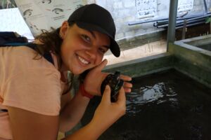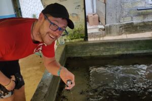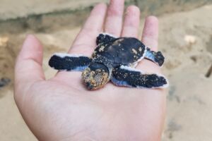 Zprvu jsme lehce rozpačití, pan průvodce nám ukazuje jaké želvy v přírodě jsou a 4 ze 6 prezentovaných druhů prý uvidíme. Stojí mezi kopečky písku, což jak se Jája mylně domnívala, nejsou želví hrobečky, ale zahrabané snůšky vajec. Nějaká nefunkční vajíčka tvaru pingpongového míčku jsme dostali i do rukou a náhle nás průvodce volá do písku k sobě. Jeden ze vzdálenějších kopečků druhý muž rozhrabal a v písku se to hemží maličkými želvičkami. Mám trochu podezření, že je to zas jen turistická atrakce a želvičky tu mají v písku dopředu nachystané, ale budiž. Jája dostala jednu z nich do ruky a donesla ji až do nádrže s vodou plné obdobně malých stvoření. Želvička se ihned aktivně zapojila mezi ostatní malé plavce a po chvilce bychom jí ani nenašli. Chvíli mrňata otravujeme našima rukama a samozřejmě se s nimi musíme řádně vyfotit. Ty které mají vidět pupík jsou čerstvé, ostatní už jsou v nádrži 2-3 dny a třetí den jim dovolená končí cestou do moře. Další nádrže jsou plné větších želv, ty tu zůstávají i několik let, aby nakladly vejce a hlavně získaly odolnost. Malá miminka jsou totiž oblíbenou potravou různých ptáků i dravých ryb, a míra přežití je minimální. Jestli jsme to správně pochopili, tak lidé vajíčka i jedí, a každý příspěvek znamená šanci na vykoupení víc těchto vajec… Některé zde žijící želvy jsou i zraněné nebo mají deformace krunýře a podle vážnosti se buď po zotavení vrátí do moře, nebo zde už dožijí svůj nešťastně zakončený život. Pan průvodce byl vtipálek a ukázal nám i neviditelnou želvu, jakou svět neviděl, haha. Mimo vstupného se také nebojí si říci o další příspěvek, jelikož jsou soukromá společnost a starat se o tolik želvátek asi nebude úplně snadné – už jen je nakrmit…