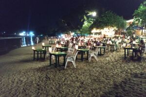 Dáváme příspěvek necelých 100 rupií a jdeme povinně do krámku, kokosový olej tu mají desetkrát dražší než máme vystavený ke koupi ve vile, tak raději mizíme. Široko daleko není kromě želv už nic zajímavého. Přidal se k nám na cestě jakýsi přiopilý podivín, naštěstí nás ani neokradl ani nezmrzačil, a nám se ho po cestě podařilo šikovně předat německým turistům – poznámka ženy: slyším za zády Pietra jak mi postichu říká: kdyby mě ten chlápek bodl, tak utíkej! Když jsme je potkali podruhé, tvrdili, že už je nenávratně po něm, asi mají nějakou praxi ve zbavování se nepohodlných. Najít další restauraci na večeři nám zabralo celkem dost času. Hledání bylo sice úspěšné, ale toho místního stylu už na nás bylo celkem dost. U stolu se nám snaží vnutit do přízně nějaký válečný veterán a moc nechápe, že nejsme ani Němci, ani Rusové. Jídlo dobré, ale připadali jsme si zde hodně nepatřičně.