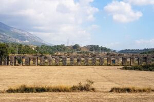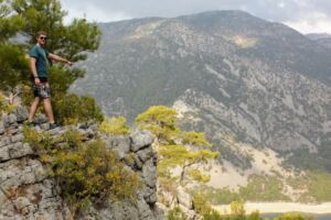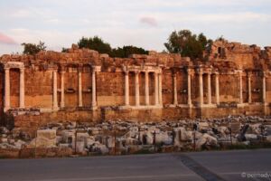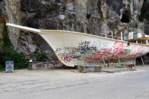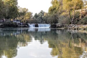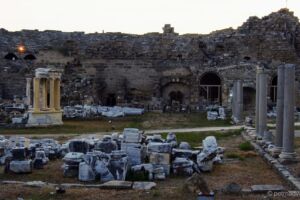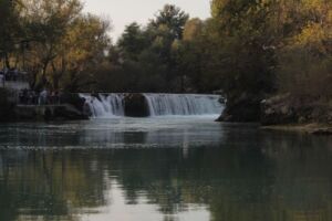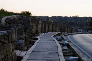 Dále jsme pokračovali několik desítek kilometrů směrem k oblasti Manavgat. Nejprve jsme dojeli k přehradě Oymapinar, cesty byly neskutečně špatné, děravé, vyspravené náhodnými materiály a navíc ještě klikaté. Při příjezdu k přehradě se platí něco jako mýtné, poplatek za vjezd do oblasti činí 2 liry, takže asi 12 Kč. Podél cesty jsme zahlídli zachovalý viadukt a pokračovali dál. Poslední úsek byl hodně do kopce, až se z toho malé Suzuki začalo trochu zadýchávat a rozsvítila se mu kontrolka motoru. Nicméně jelo stále stejně jako dosud, zajímavější to bylo ale s benzínem, kterého už nezbývalo moc a Jáje bylo z představy utonutí hlady v tureckých horách značně nevolno. Po vystoupání k přehradě se ale naskytne suprový pohled na hráz a rozlehlou vodní plochu s posprejovaným torzem lodi za zády. Vyjeli jsme ještě o kousek výše se podívat pěkně z vrchu, ale cestou k výhledu se muselo trochu zariskovat a lézt po kamenech, a tak jsem si jej užil jen já. Cesta z kopce byla veselejší, vyrazili jsme směrem k Manavgat waterfall, neboli manavgatskému vodopádu. Podle mapy jsme dojeli až k místu, kde vodopád skutečně byl, ale na naší straně řeky nebylo zhola nic, za to na protějším břehu stál McDonald’s… Jája se obětovala a přebrodila kvůli hezčím fotkám řeku, já se věnoval focení jen ze břehu. Cestou jsme potkali několik stromů plných ovoce, a tak jsme si z výletu dovezli ještě pomeranč a granátové jablko (ty se prodávaly tou dobou úplně na každém rohu). Než jsme zamířili domů, projeli jsme Manavgatem k oblasti Side plné antických ruin. Jízda byla mírně stresující, jelikož jsme se dostali do centra města plného lidí, aut, skútrů a dokonce již svítila kontrolka benzínu, o které jsem se domníval, že nefunguje. Naštěstí jsme brzy dojeli k benzínce – místní systém funguje tak, že si řeknete, kolik čeho chcete natankovat, obsluha se ke stojanu přihlásí čipovou kartou, zadá potřebné údaje a vy si pak jdete akorát zaplatit a účet ukážete obsluze. Jazyková bariéra může být mírným problémem, ale odjeli jsme natankovaní. Antické ruiny byly Jájou označeny za „pouhé kameny“, mě se ale pohled na starou fontánu a divadlo líbil, většina míst je přístupná a může se mezi jednotlivými rozvalinami procházet. Když jsme místo opouštěli, byla už tma a my zamířili vyčerpaní dlouhým dnem zpět na hotel. Cestou nás potkala ještě nepříjemná objížďka v husté dopravě, ale přežili jsme vše, i když pruhy se na silnicích občas znenadání zužují. Při předání auta proběhla vizuální kontrola a my byli propuštěni, zmizeli jsme rychle, než někdo zjistí, že svítí kontrolka… ale zase jsme se poctivě vrátili odevzdat zapomenutý technický průkaz, který očividně nikomu nechyběl a auto už bylo tou dobou fuč.