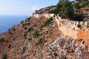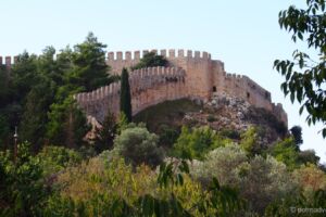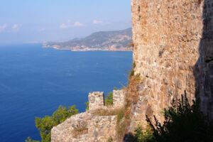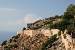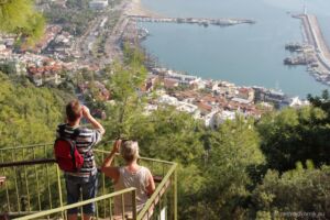 Autíčko jsme si večer trochu vyzkoušeli, natankovali trochu benzínu, zjistili, jak dokáže přeskočit neznačený retardér a nechali ho na druhý den. To jsme vyrazili omrknout tu pravou Alanyi, městečko s hradem pyšnícím se na hoře vyčnívající do moře a s typickou Červenou věží. Zastavili jsme pod kopcem s hradem, nedaleko stanice lanové dráhy a cestu na hrad Ehmedek jsme si usnadnili lanovkou stojící několik desítek lir. Za ten výhled to ale určitě stálo, pěšky by se nám takové pohledy na město shora nemohly naskytnout a vypustili bychom duši. Z hradu zbyly převážně jen hradby rozeseté po celém kopci, ale pohled je to hezký a určitě stojí za návštěvu. Tam, kam vede lanovka, se neplatí žádné vstupné, ale dá se dojít i na úplný vrchol kopce, kde se bohužel musí již zaplatit a to jsme si nechali ujít. Shora jsme také viděli velký nápis ve stylu Hollywoodu na protějším kopci, hlásající I <3 Alanya, a rozhodli se k němu později dojet. Cestou dolů jsme již z dálky viděli Červenou věž, a tak jsme měli směr poměrně jasný. Zhruba v polovině kopce jsem navrhl přímější zkratku, která byla sice přímější, ale za to o poznání horší cesta vedoucí mezi rozpadlými domky po kamenech. Nicméně mapa ukazovala, že tudy cesta vede, a tak se šlo! Po chvíli lámání nohou jsme byli nad věží a po další chvilce už pod ní u přístavu. Místní prodejci všude nabízejí výlet na party lodi, ale vyjet 100 m od břehu a tam trsat na současné popové hity nás příliš nelákalo. Kopec jsme obešli zpět k jimnymu, našli v mapě cosi s názvem Alanya View Terraces a doufali, že ten obří nápis bude tam. Měl jsem při výběru cíle cesty trochu štěstí a opravdu jsme vystoupali do kopců těsně pod onen nápis, společně s krásným ale nezachytitelným rozhledem na město a moře. Porozhlédli jsme se a vyrazili dále, přes hotel, kde jsme udělali krátkou odpočinkovou pauzu na oběd.