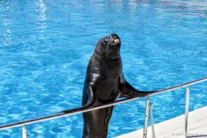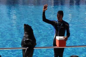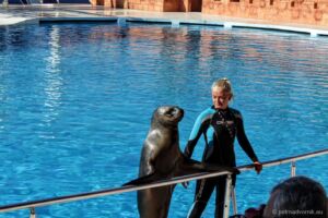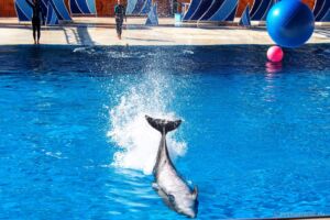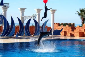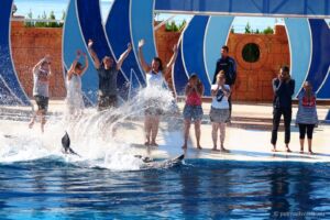 Využili jsme možnosti zajet si do nedaleké Sealanye na delfíní show (25€, z toho 23€ vstup), vyzvedl nás minibus, nabral ještě pár lidí a za chvíli jsme byli na místě. Delfinárium k mému překvapení ale neobsahovalo vůbec nic jiného, než tribuny pro nás a bazény pro delfíny, které nejsou před otevřením pár minut před vystoupením přístupné. Škoda, mohlo zde být alespoň pár akvárií nebo něčeho na pokoukání, než show začne. Samotné vystoupení trvalo asi 45 minut a účastnili se ho tři hlavní „trenéři“ se svými lachtany a delfíny. Musím říci, že show byla poutavá a potlesk byl zasloužený. Je třeba počítat s tím, že i do publika dopadne spousta vody, obzvlášť, když delfíni schválně začnou cákat na první řady, nebo vystřelovat do lidí obří gymnastické míče. Dokonce bylo vybráno i pár „dobrovolníků“ z publika, kteří nic netušíc chvíli tancovali a poté dostali sprchu!